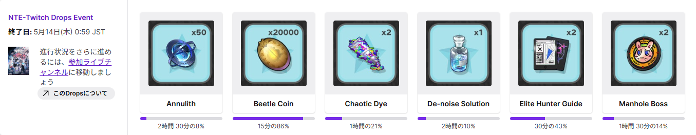 Twitchのアカウントを持ってる方は視聴時間でアイテムドロップもしてるよ。